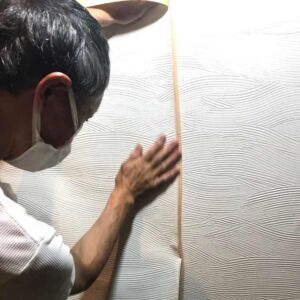 貼り作業(角や柄の合わせに気をつけて貼る)